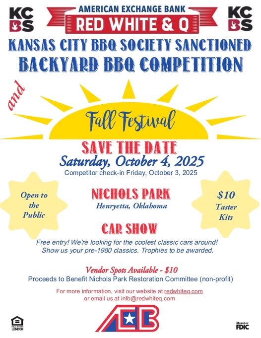 Henryetta, OK – Smoke, flavor, and community spirit will fill the air at Nichols Park on Saturday, October 4, 2025, as Henryetta welcomes the Kansas City BBQ Society (KCBS) Sanctioned Backyard BBQ Competition along with a Fall Festival and Car Show.