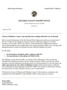 The Okfuskee County Sheriff’s Office is working in close collaboration with the remaining Okemah Police Department officers and the Attorney General’s Office to provide any and all assistance necessary during this transitional period. Our foremost priority is, and will remain, the safety and security of every citizen of Okfuskee County. While internal matters within the City of Okemah are being addressed, the Sheriff’s Office will continue to stand ready, ensuring law enforcement coverage and public safety are never compromised.